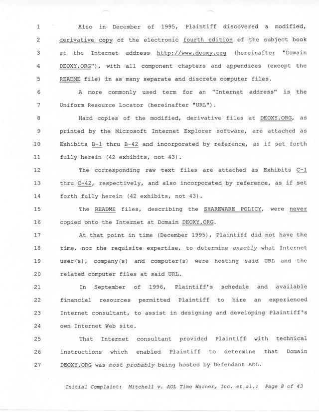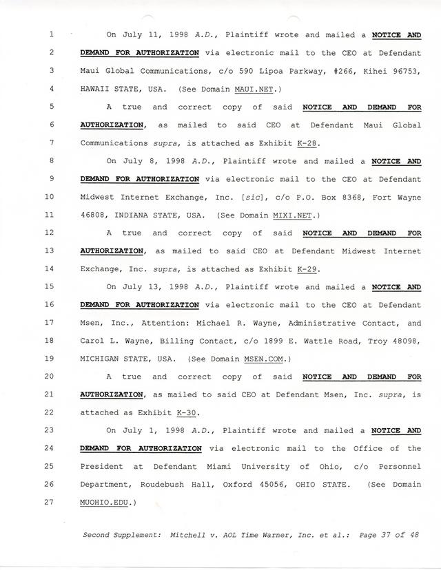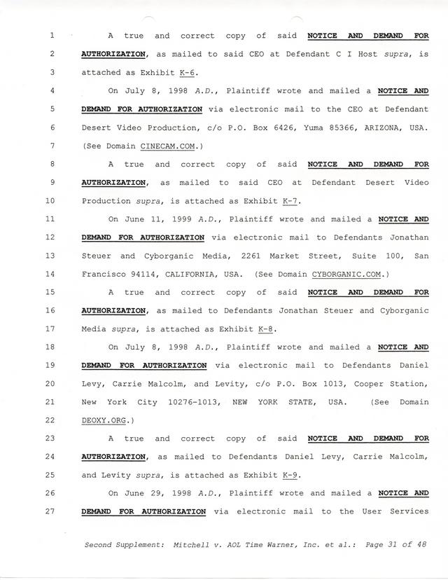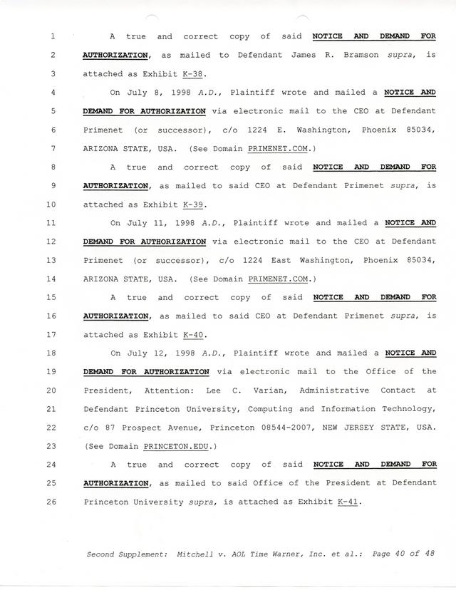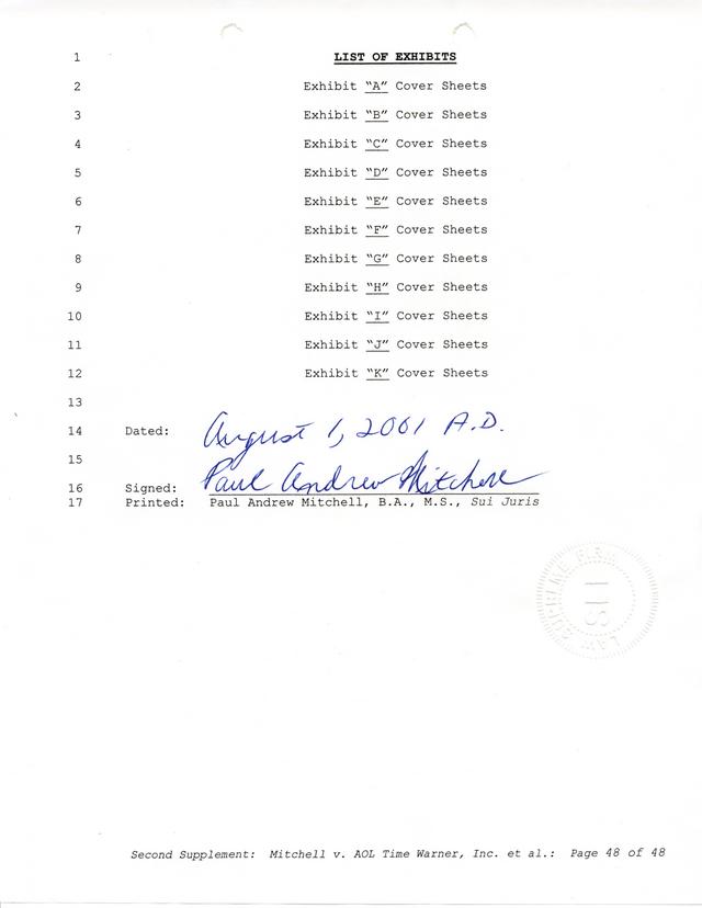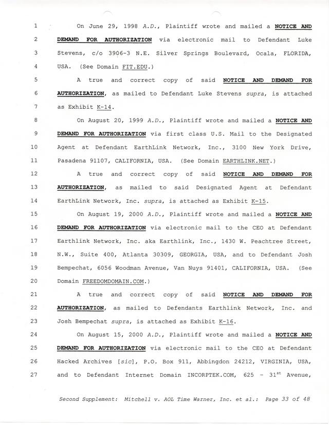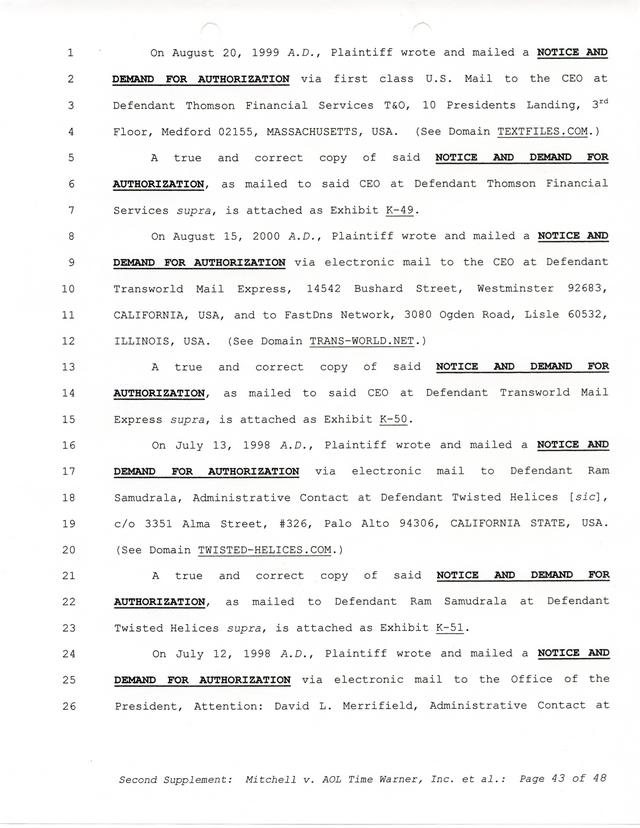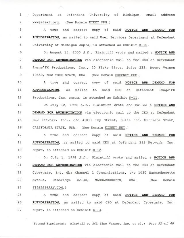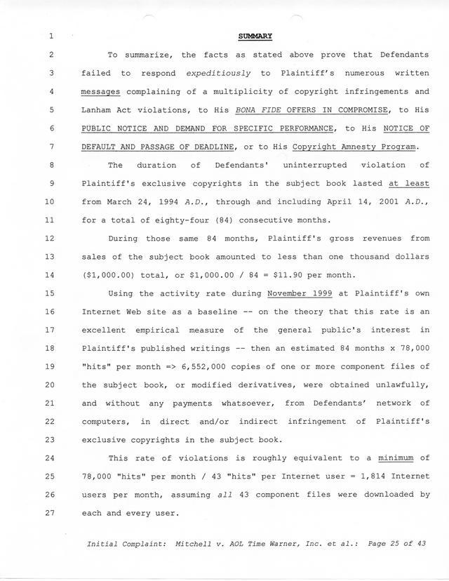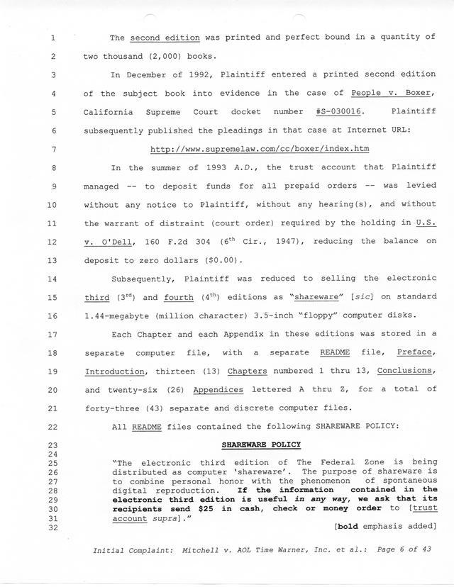 Highlights, if you don't wish to read it all: How Mitchell lost all his money and his interpretation of Shareware, the moment he became aware of the Internet and World Wide Web, the time he surveyed the entire Internet, his request for $2.6billion in damages, and his signature, including the embossed Supreme Law Firm stamp.