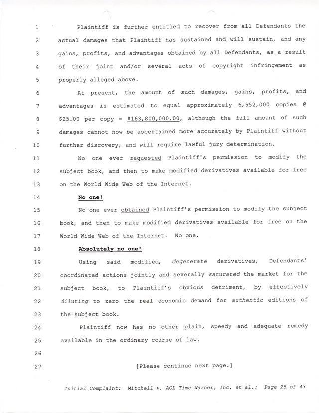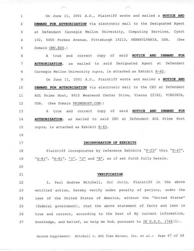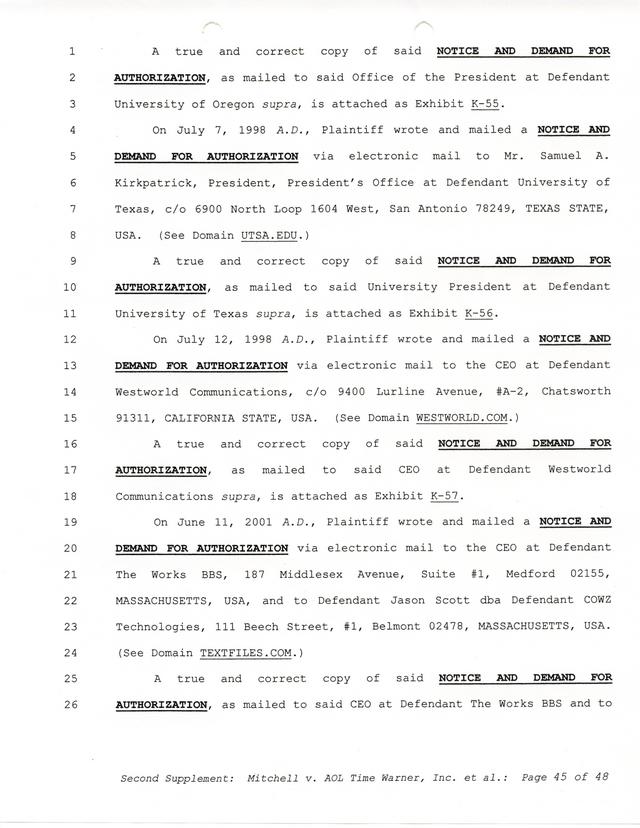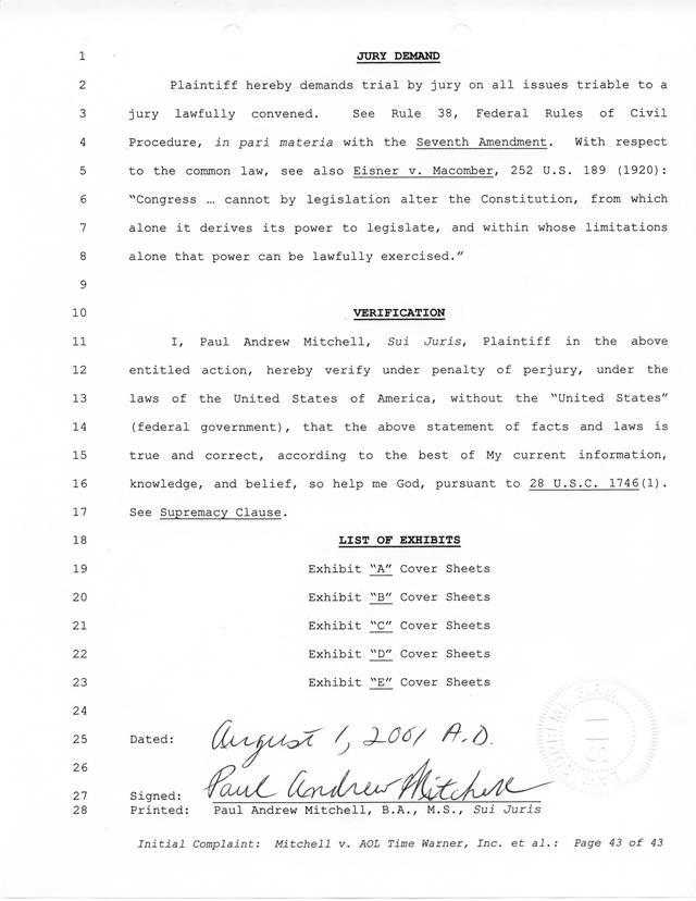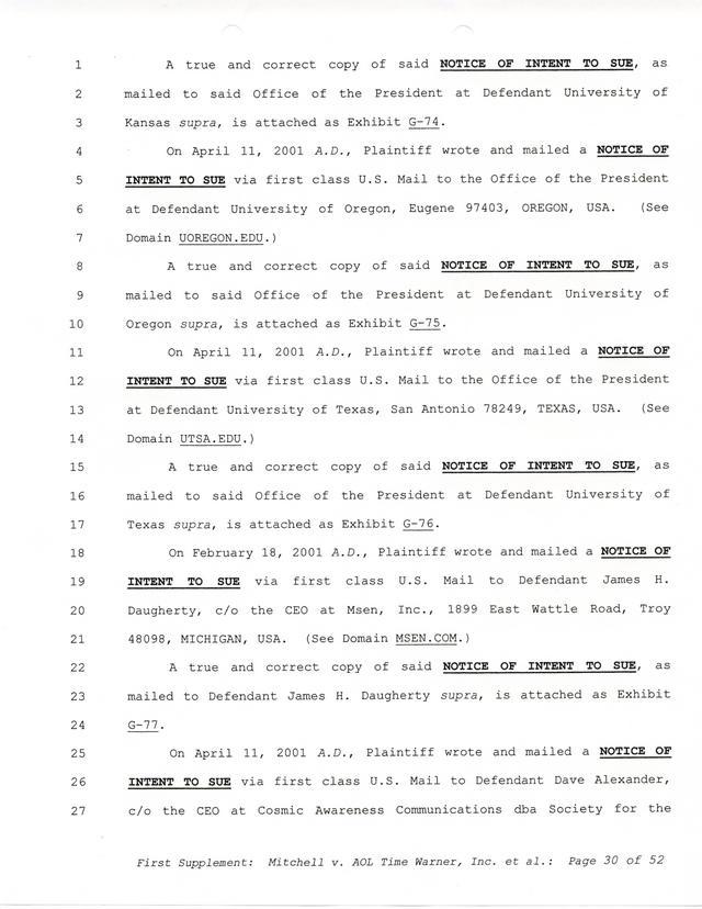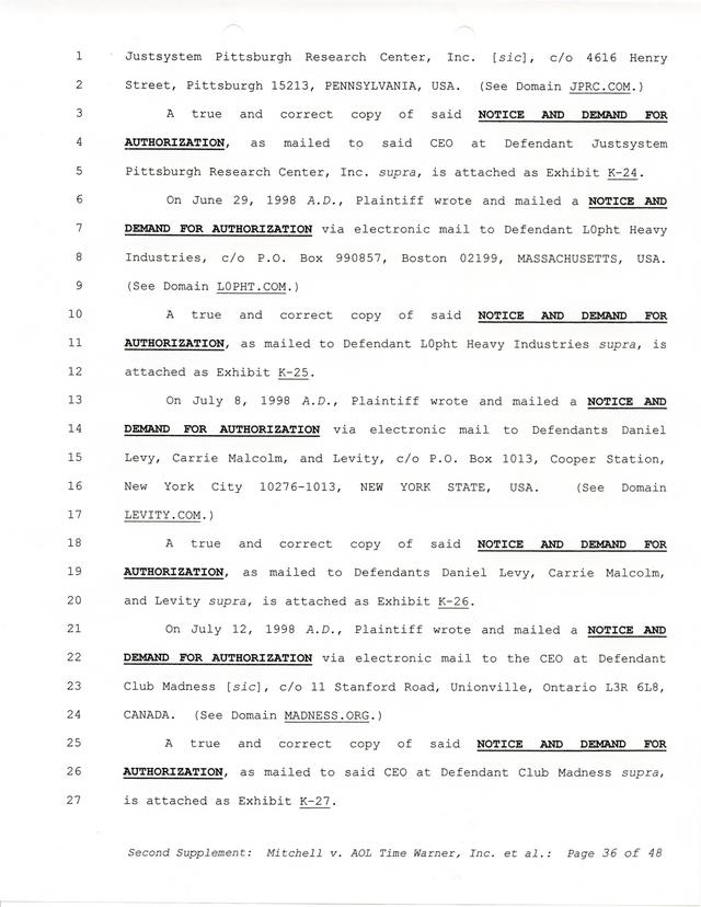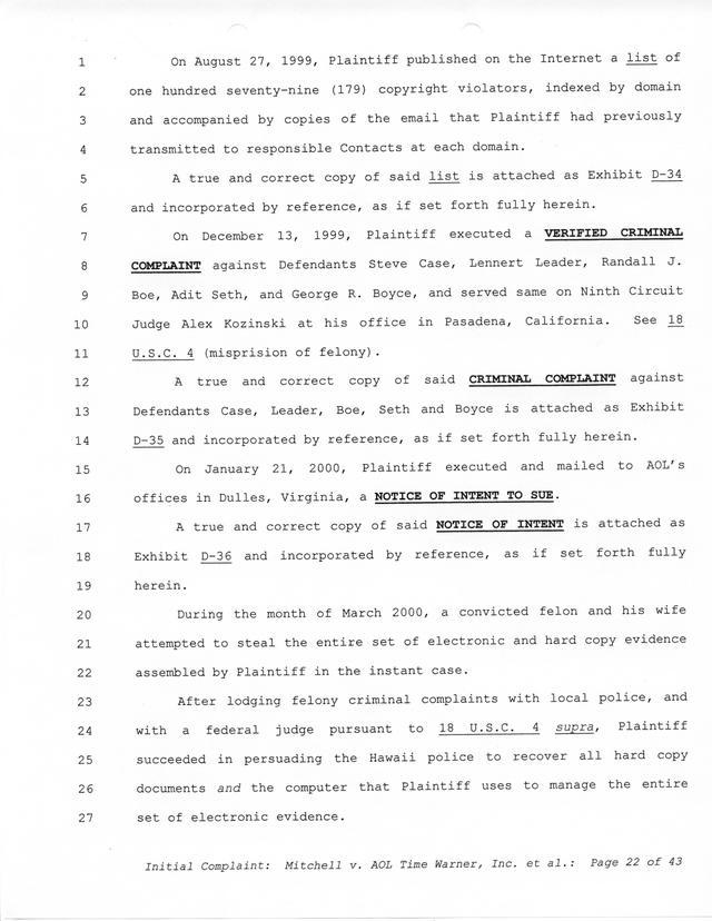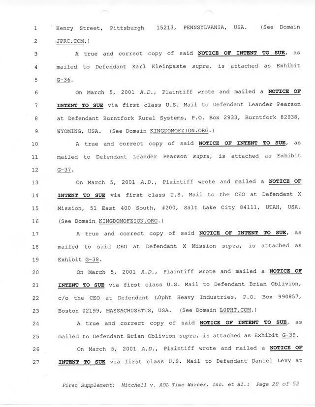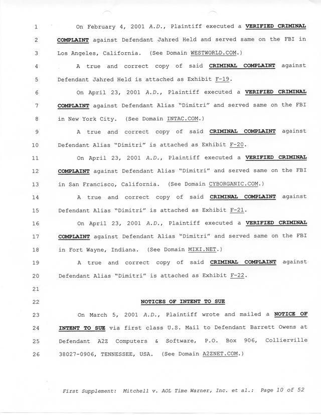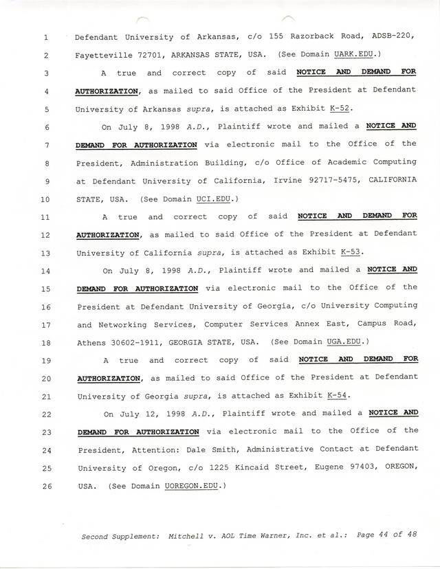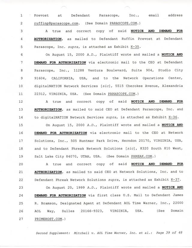 Highlights, if you don't wish to read it all: How Mitchell lost all his money and his interpretation of Shareware, the moment he became aware of the Internet and World Wide Web, the time he surveyed the entire Internet, his request for $2.6billion in damages, and his signature, including the embossed Supreme Law Firm stamp.