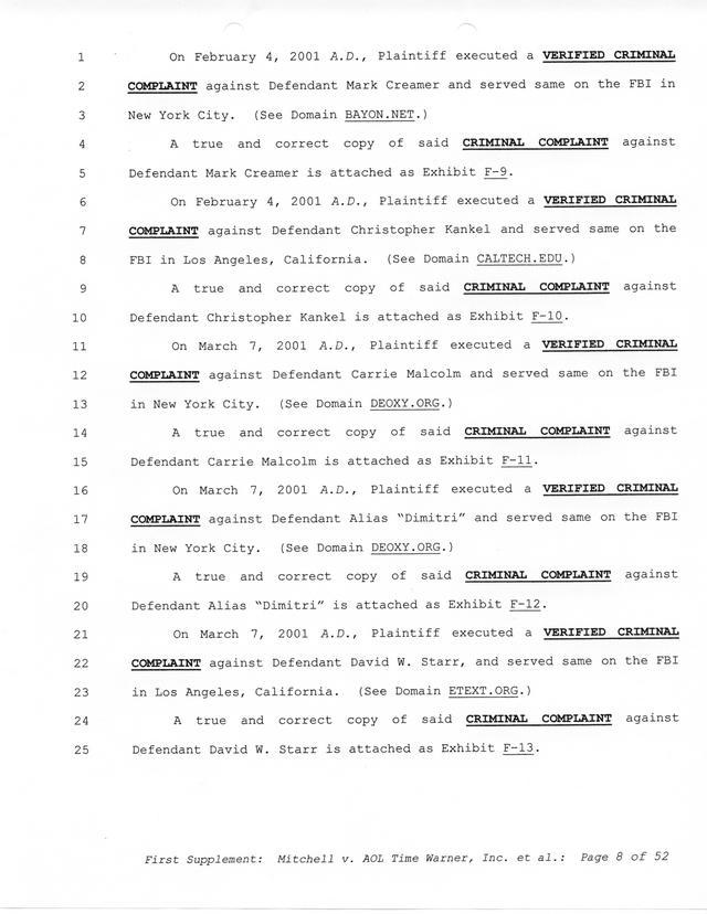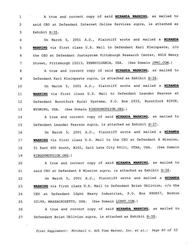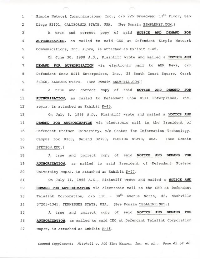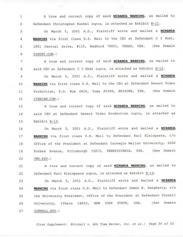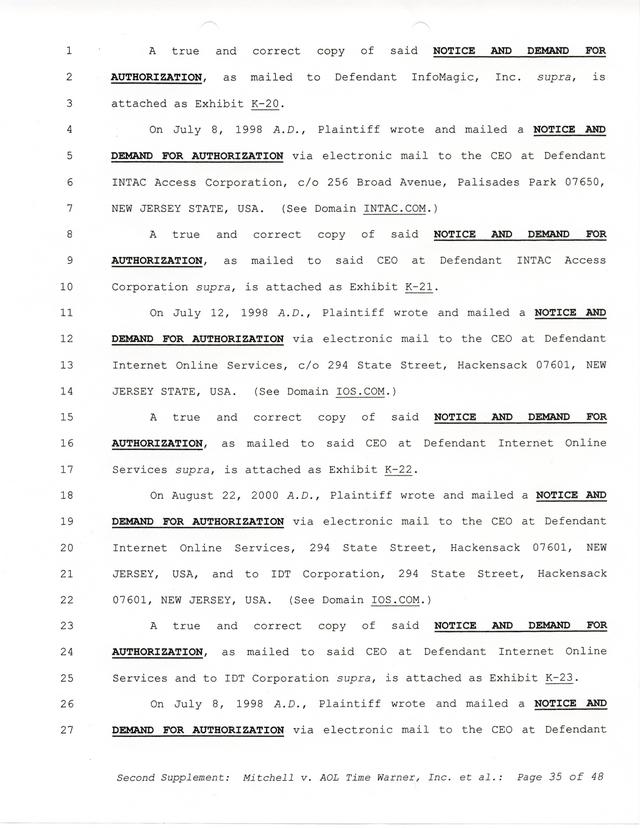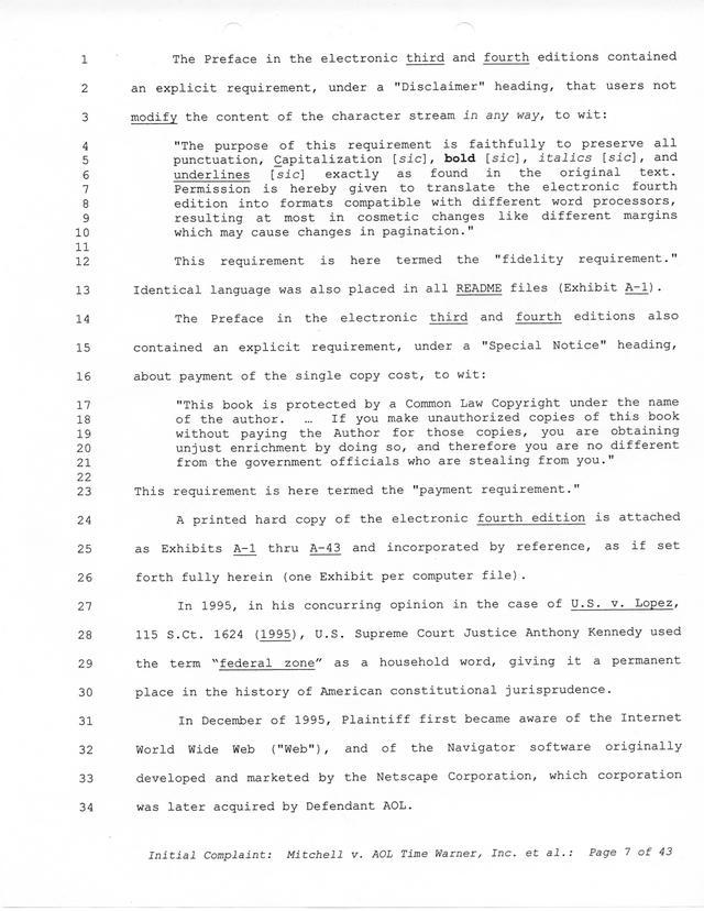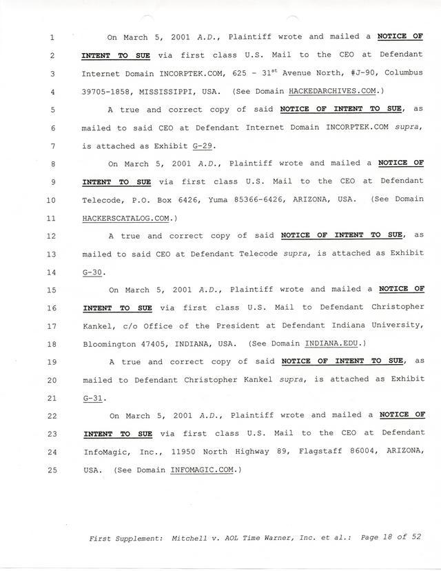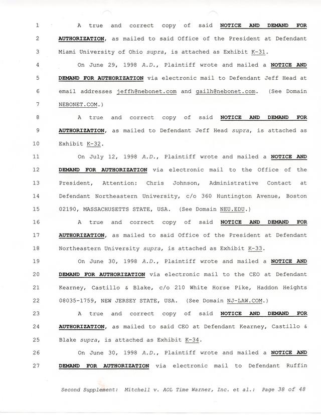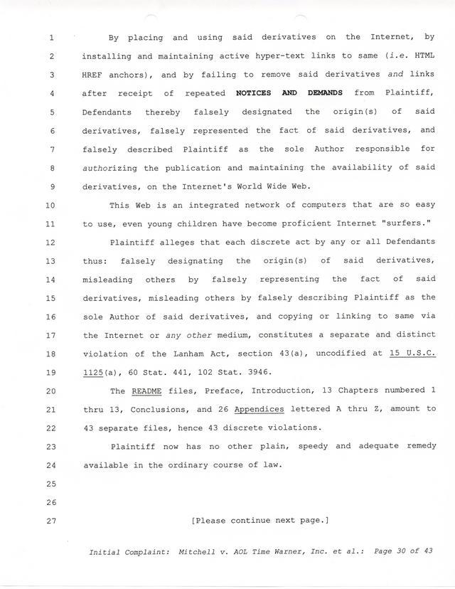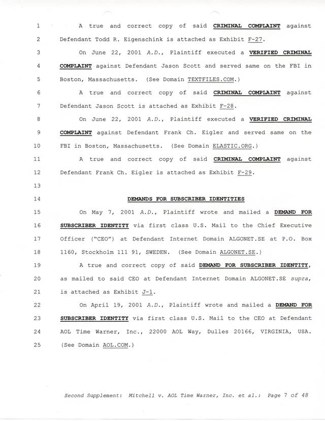 Highlights, if you don't wish to read it all: How Mitchell lost all his money and his interpretation of Shareware, the moment he became aware of the Internet and World Wide Web, the time he surveyed the entire Internet, his request for $2.6billion in damages, and his signature, including the embossed Supreme Law Firm stamp.