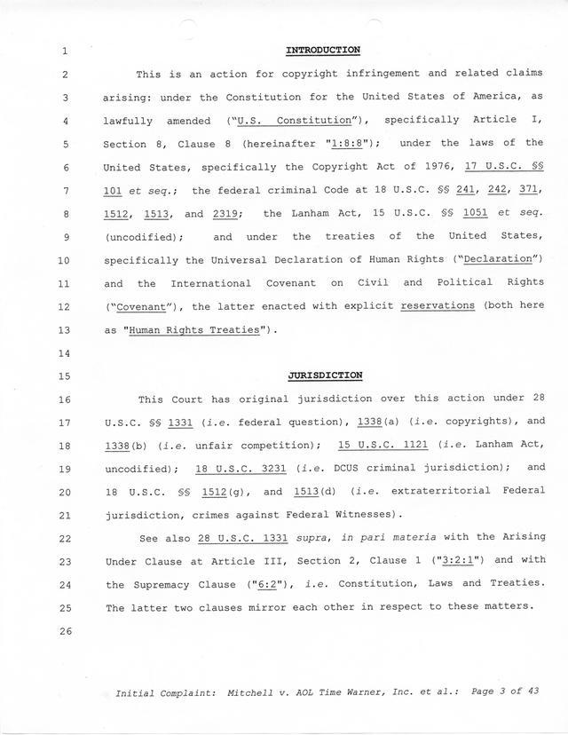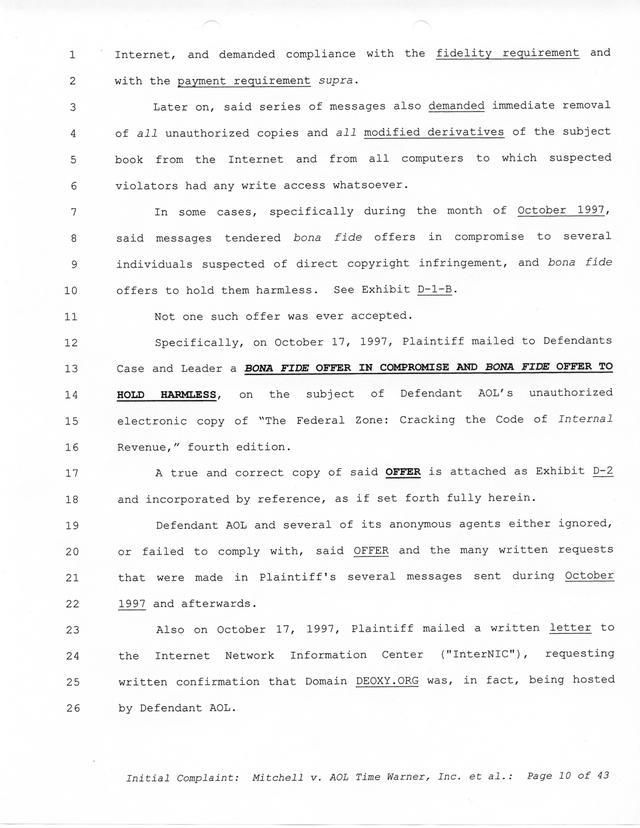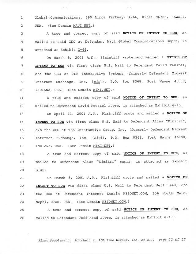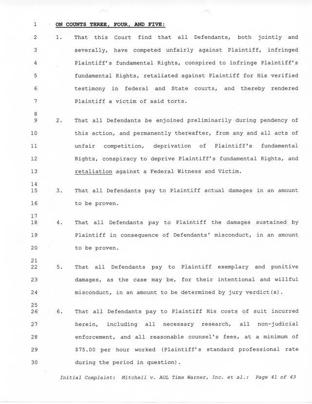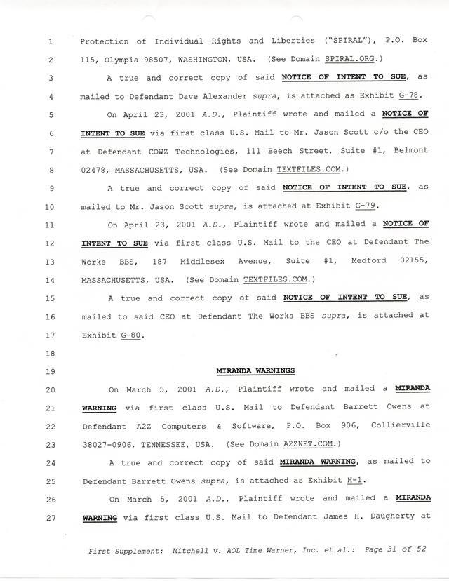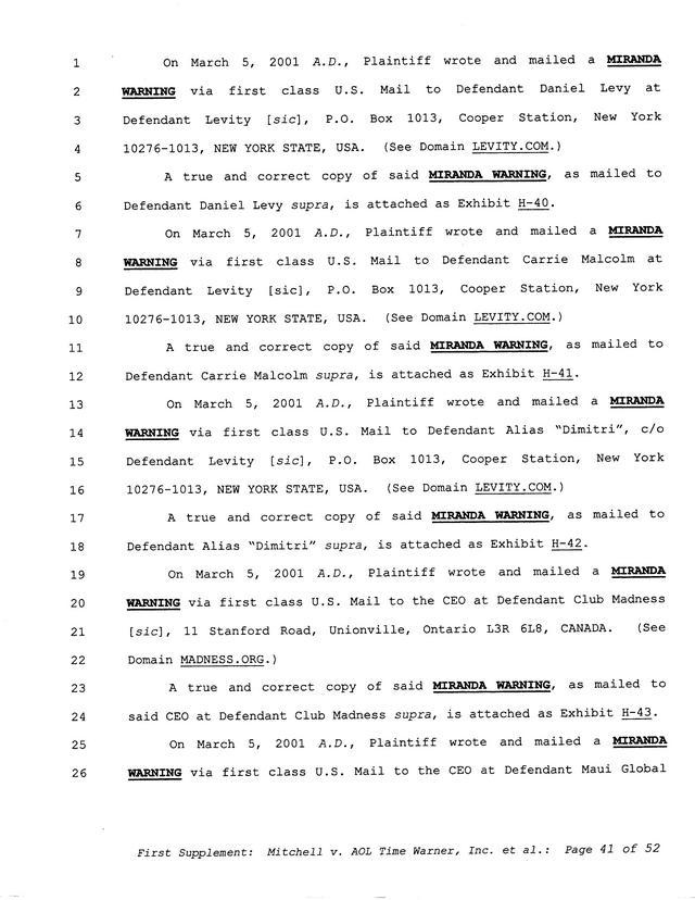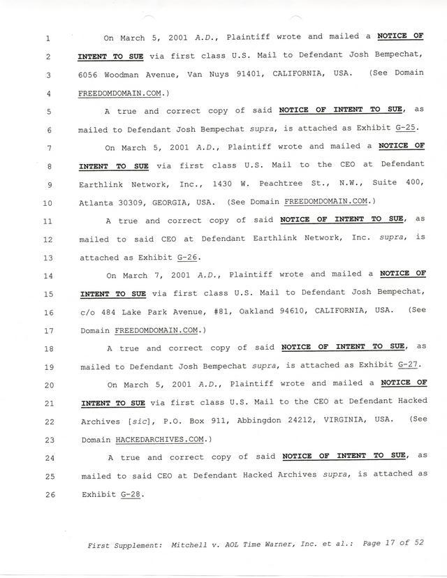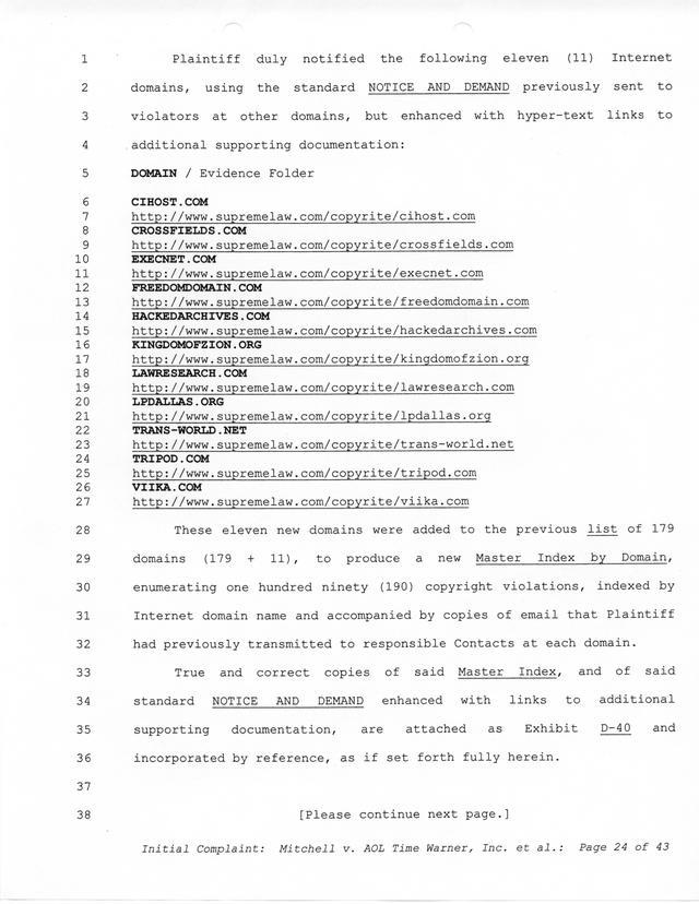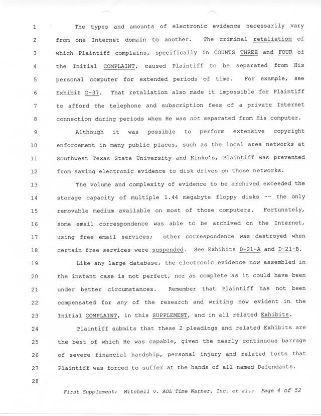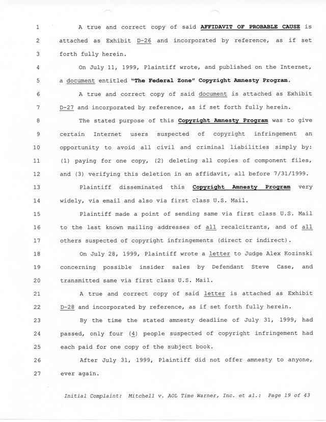 Highlights, if you don't wish to read it all: How Mitchell lost all his money and his interpretation of Shareware, the moment he became aware of the Internet and World Wide Web, the time he surveyed the entire Internet, his request for $2.6billion in damages, and his signature, including the embossed Supreme Law Firm stamp.