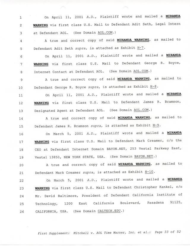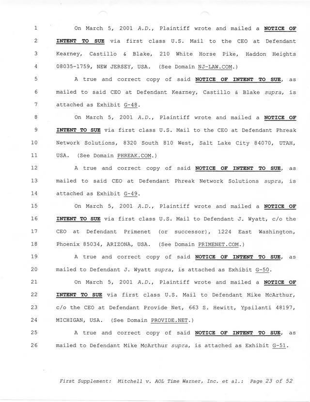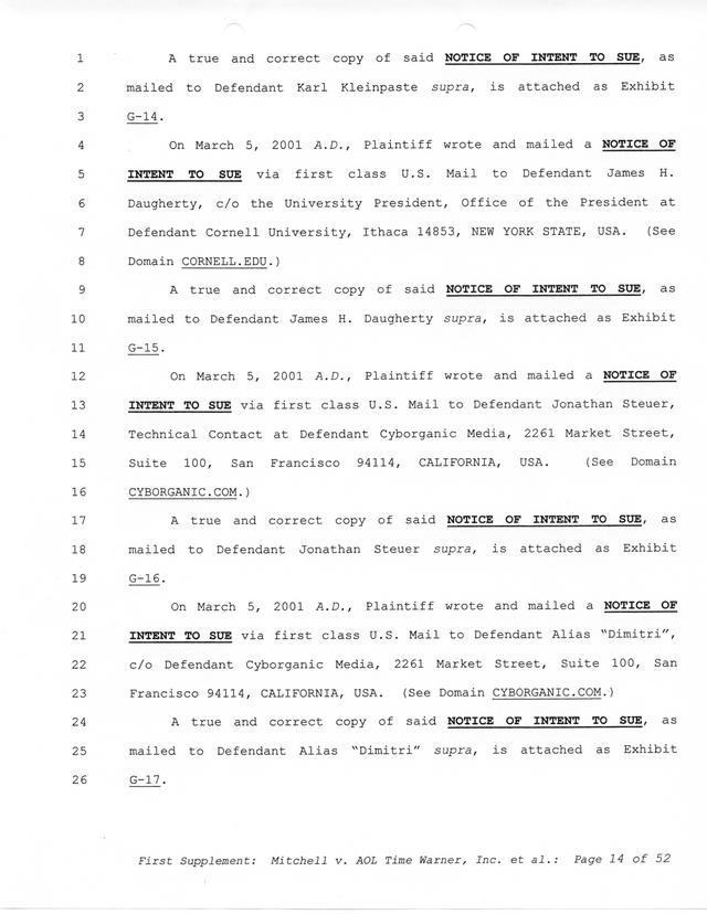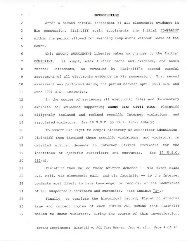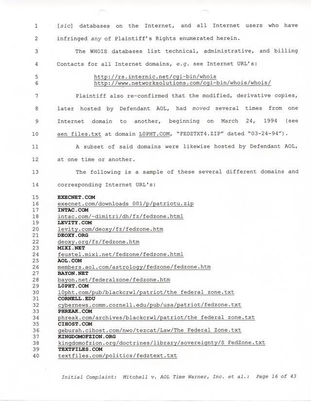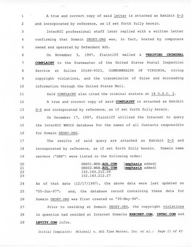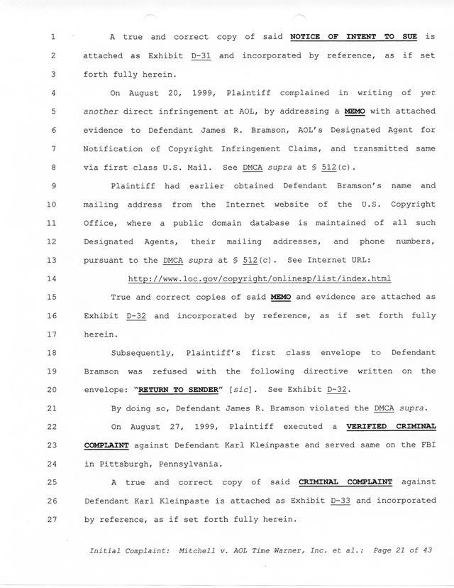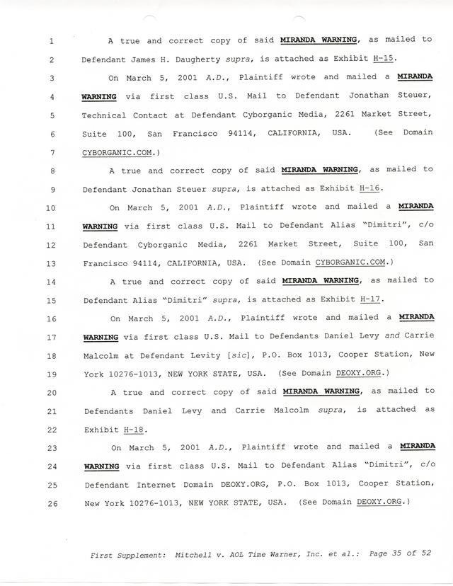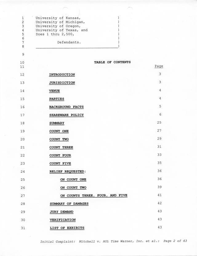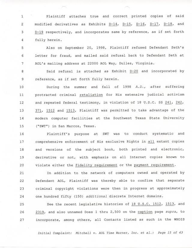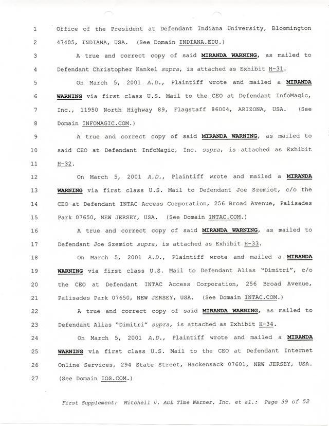 Highlights, if you don't wish to read it all: How Mitchell lost all his money and his interpretation of Shareware, the moment he became aware of the Internet and World Wide Web, the time he surveyed the entire Internet, his request for $2.6billion in damages, and his signature, including the embossed Supreme Law Firm stamp.