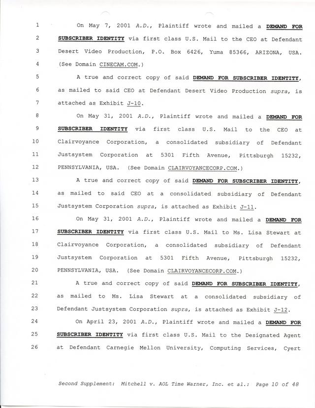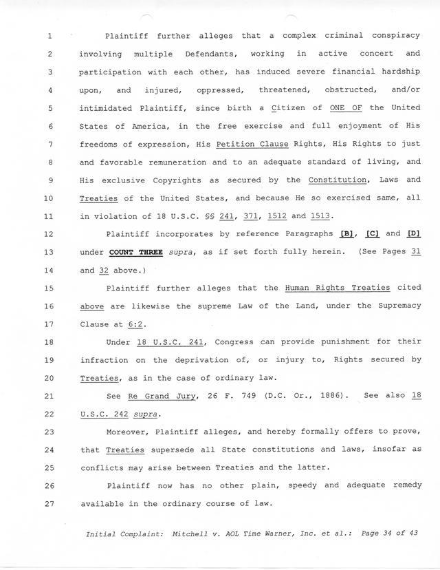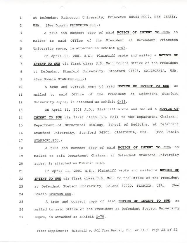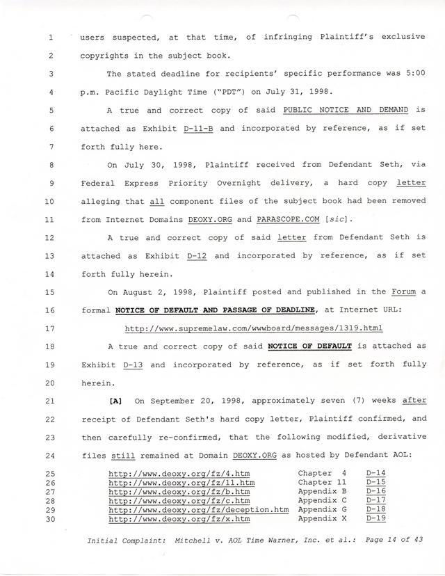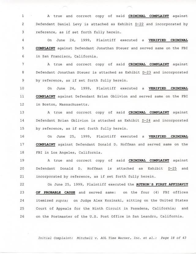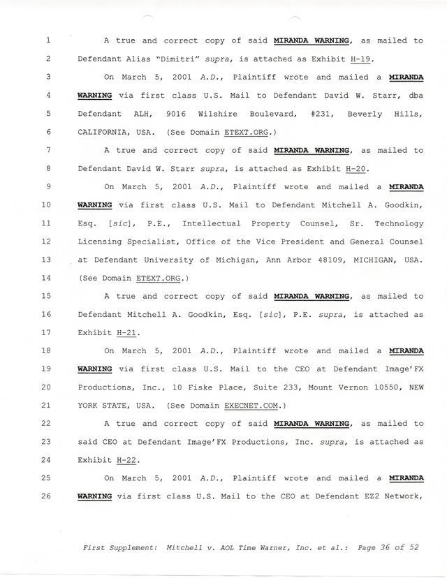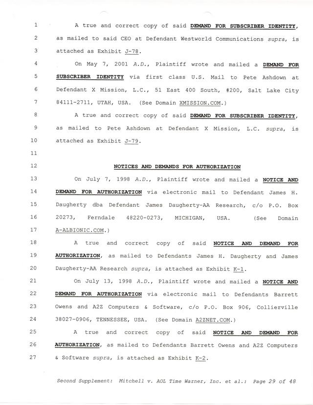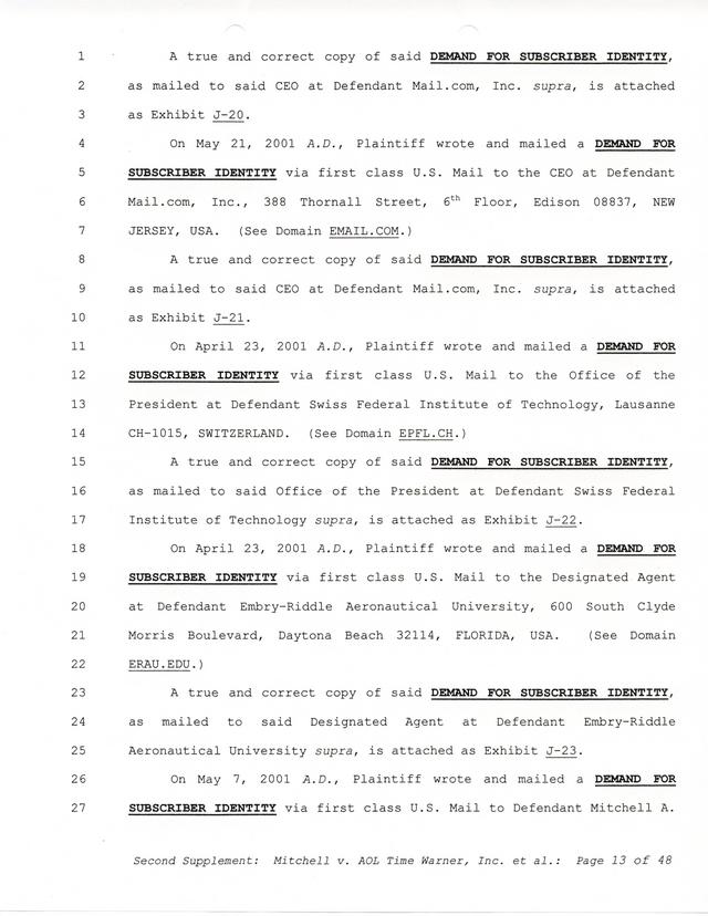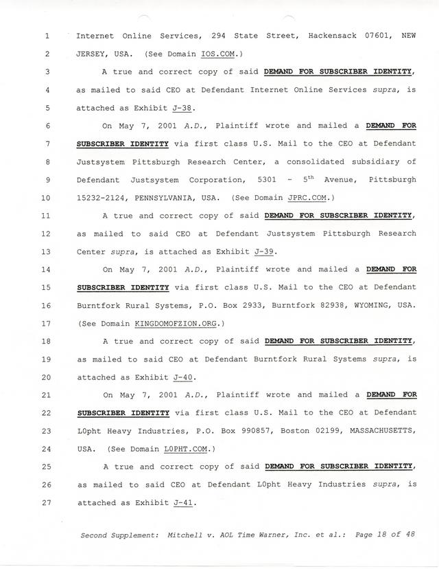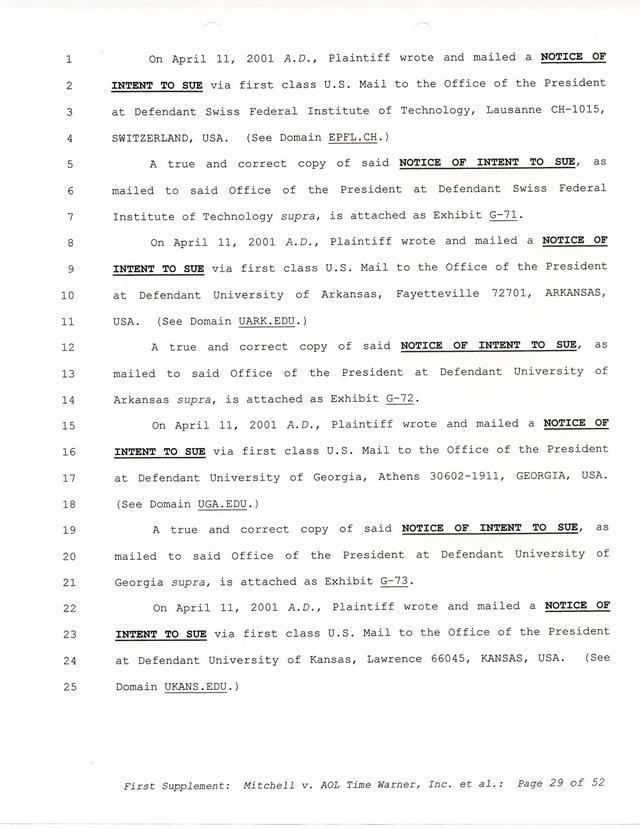 Highlights, if you don't wish to read it all: How Mitchell lost all his money and his interpretation of Shareware, the moment he became aware of the Internet and World Wide Web, the time he surveyed the entire Internet, his request for $2.6billion in damages, and his signature, including the embossed Supreme Law Firm stamp.