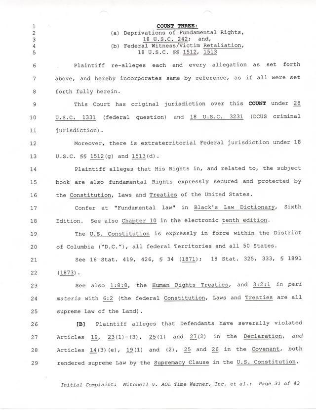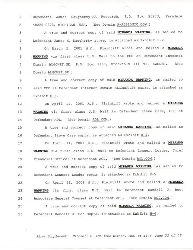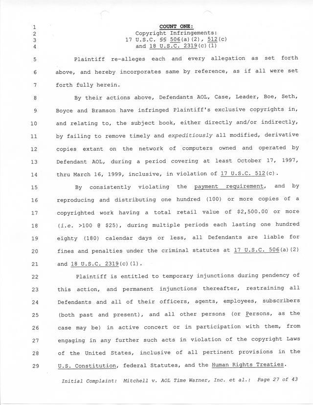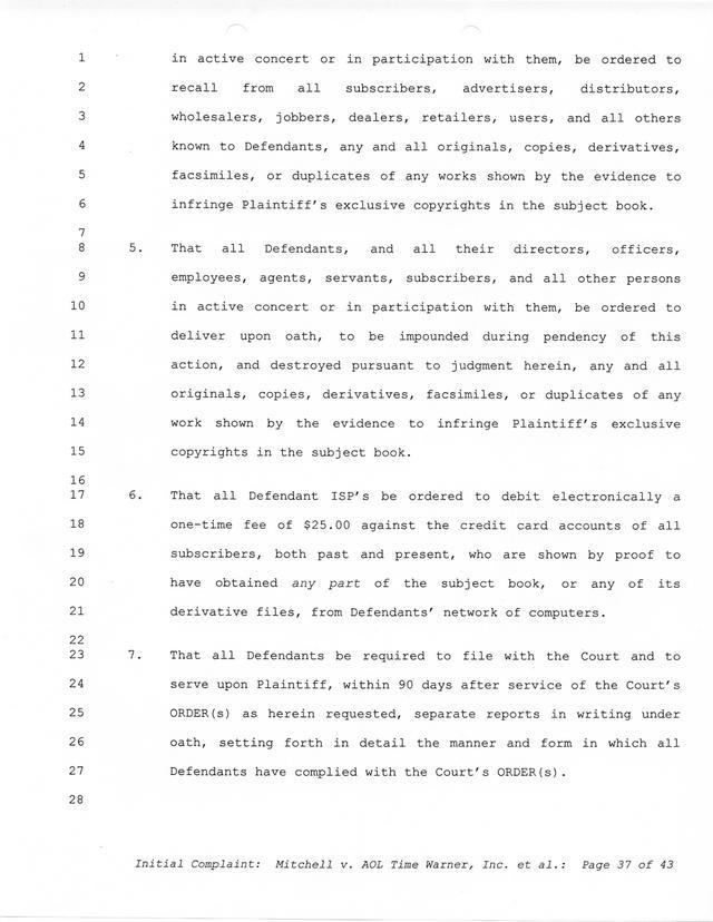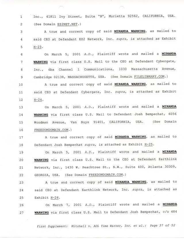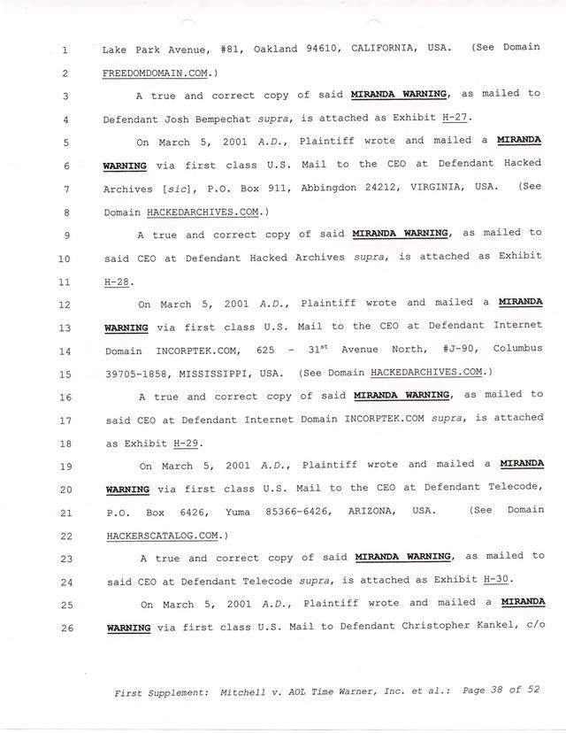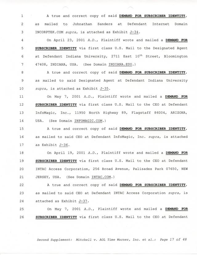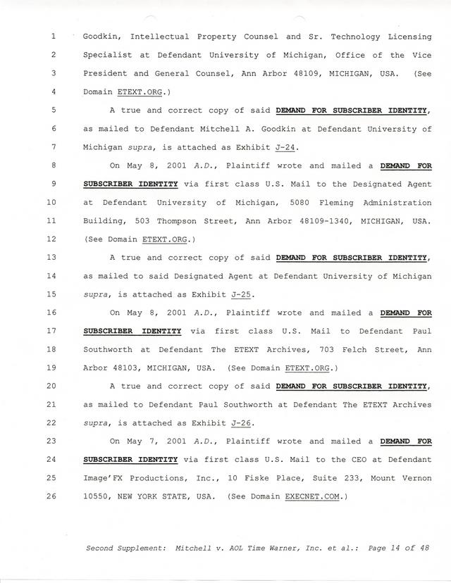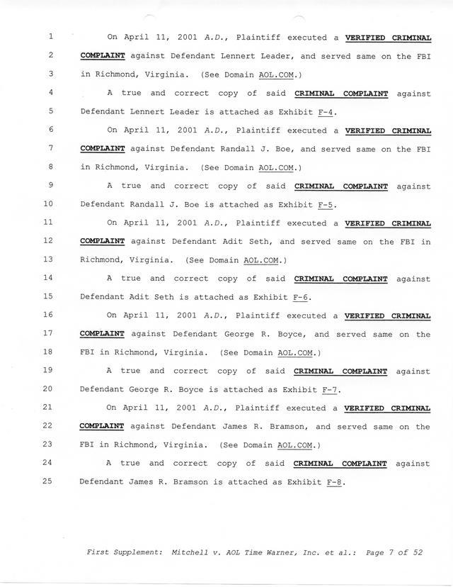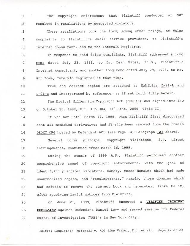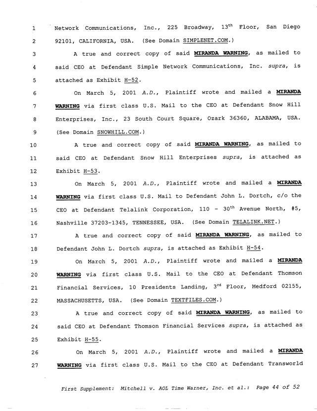 Highlights, if you don't wish to read it all: How Mitchell lost all his money and his interpretation of Shareware, the moment he became aware of the Internet and World Wide Web, the time he surveyed the entire Internet, his request for $2.6billion in damages, and his signature, including the embossed Supreme Law Firm stamp.