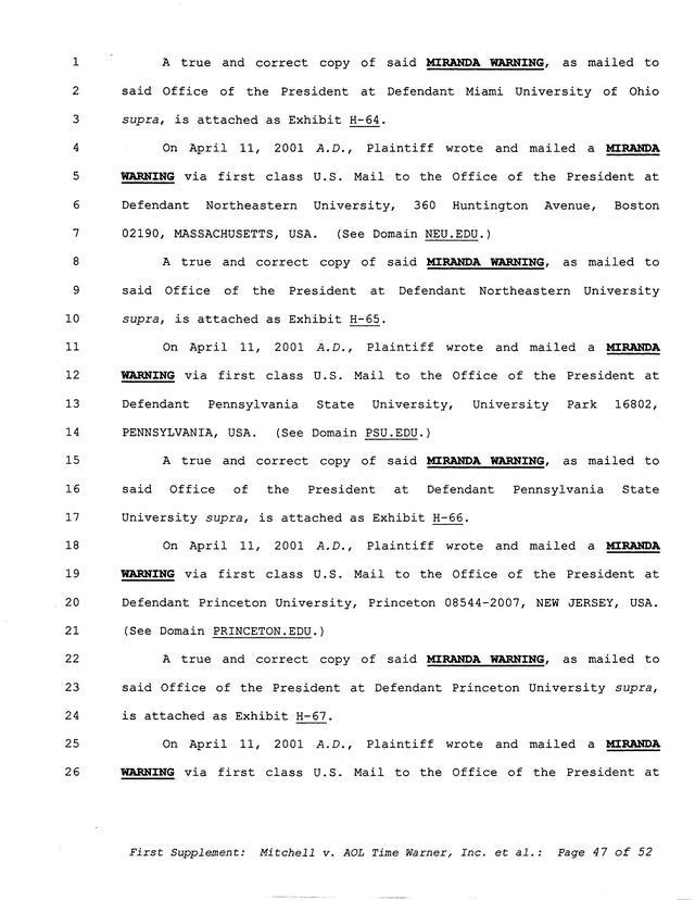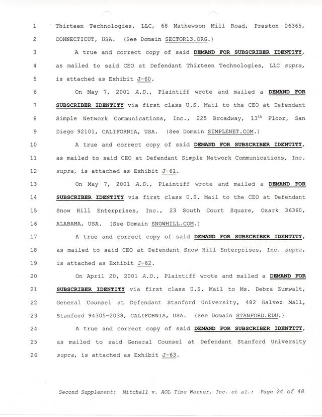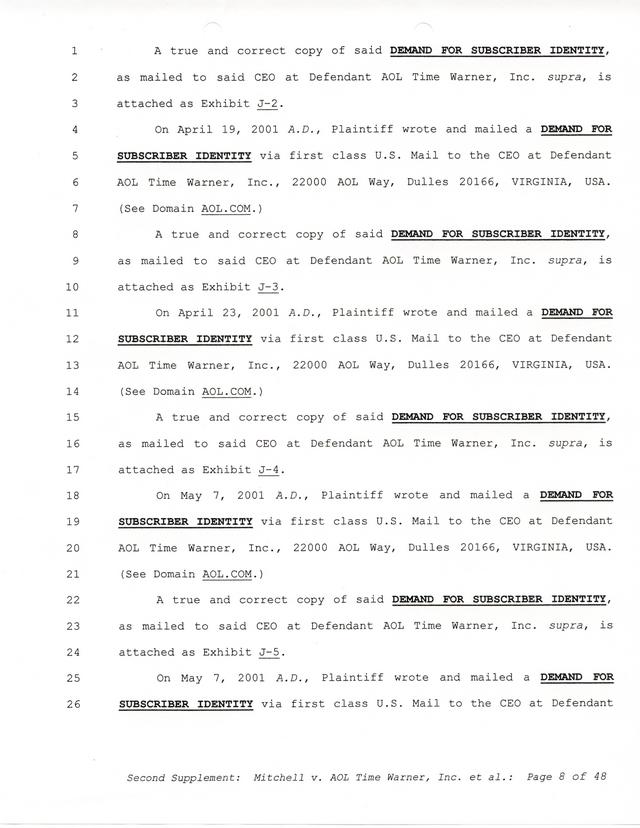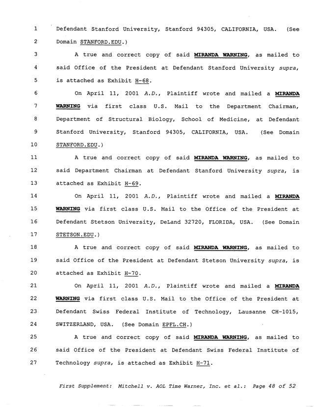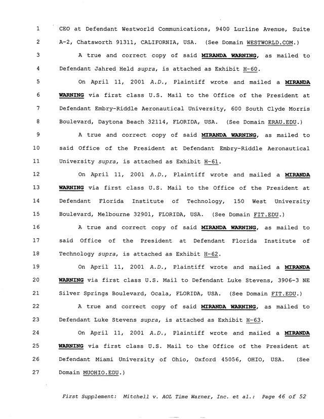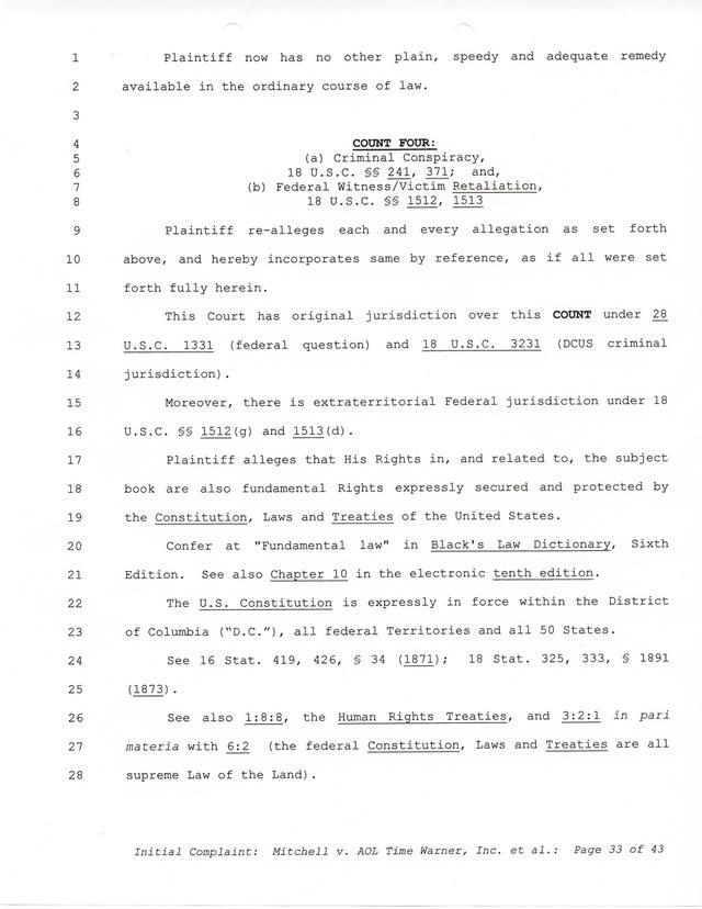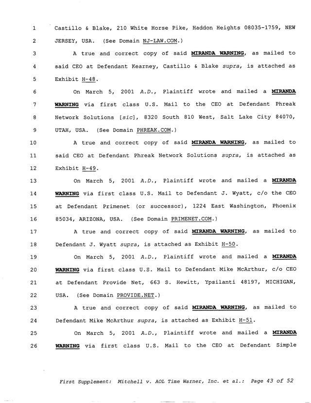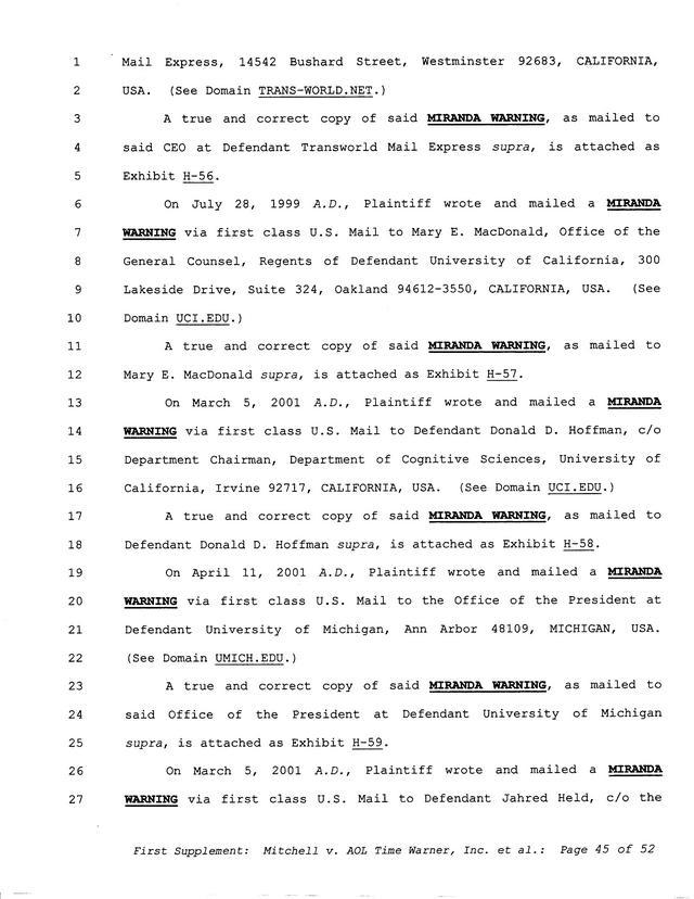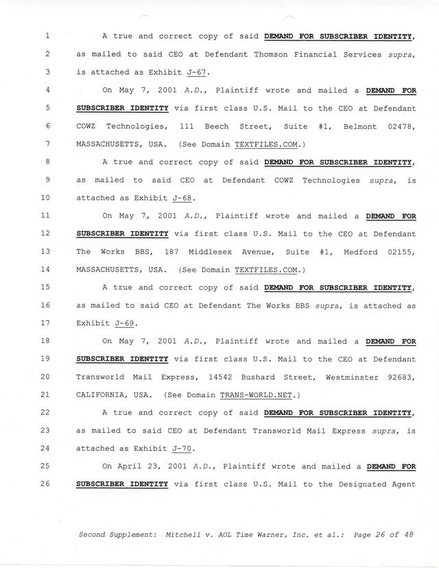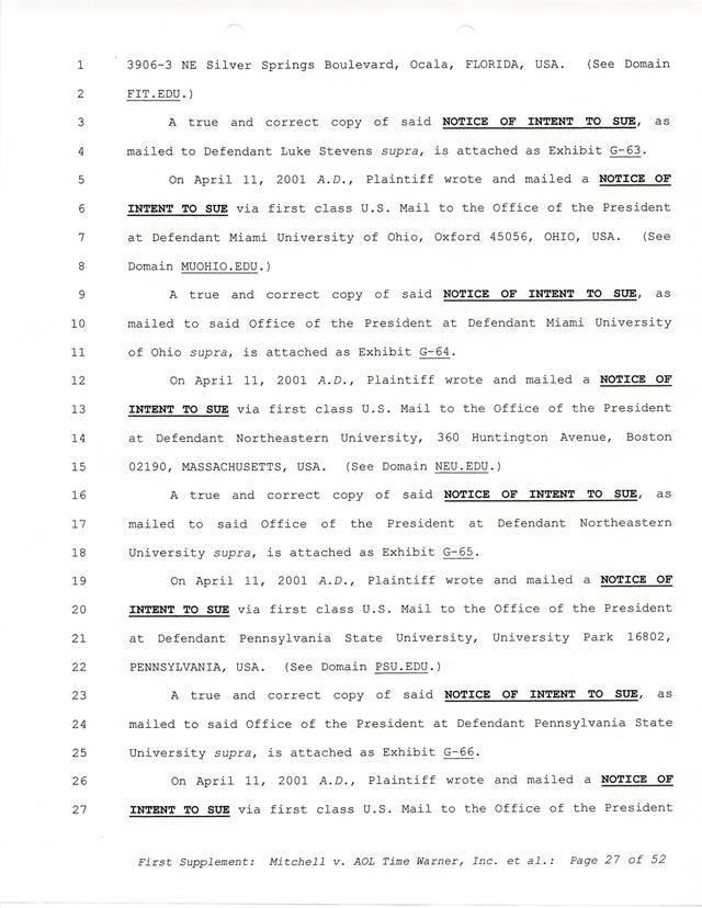 Highlights, if you don't wish to read it all: How Mitchell lost all his money and his interpretation of Shareware, the moment he became aware of the Internet and World Wide Web, the time he surveyed the entire Internet, his request for $2.6billion in damages, and his signature, including the embossed Supreme Law Firm stamp.