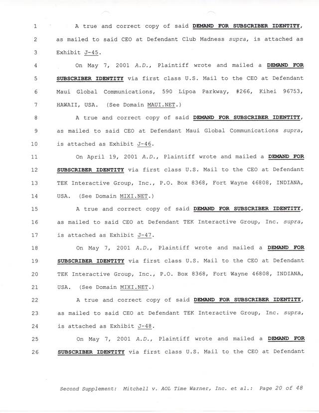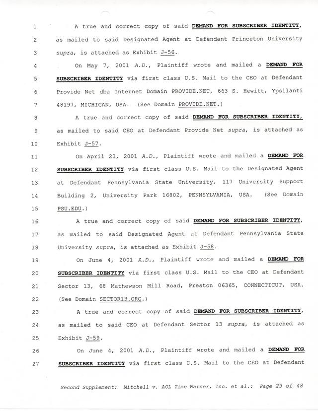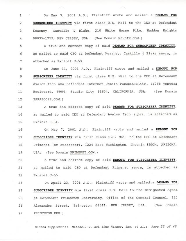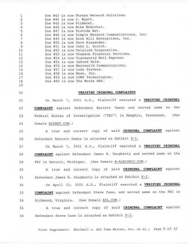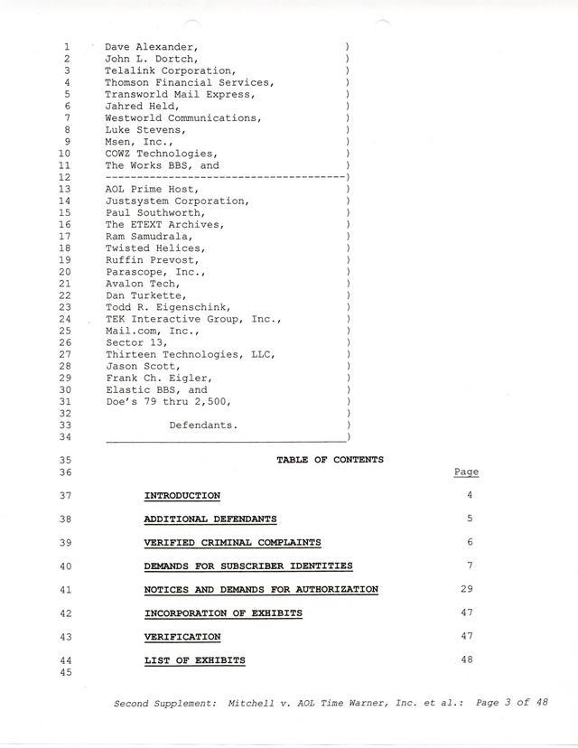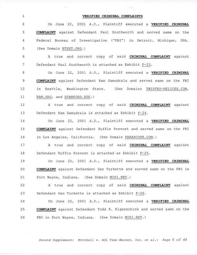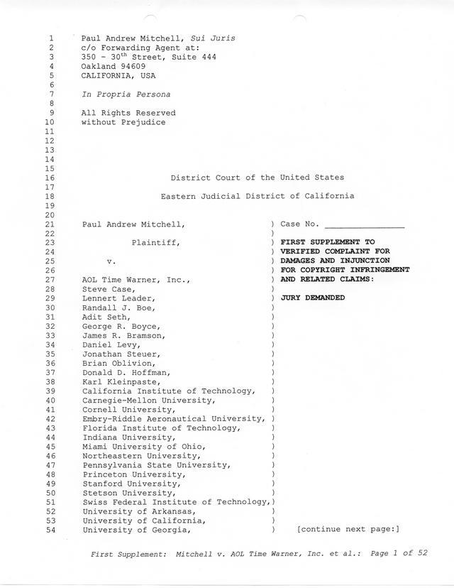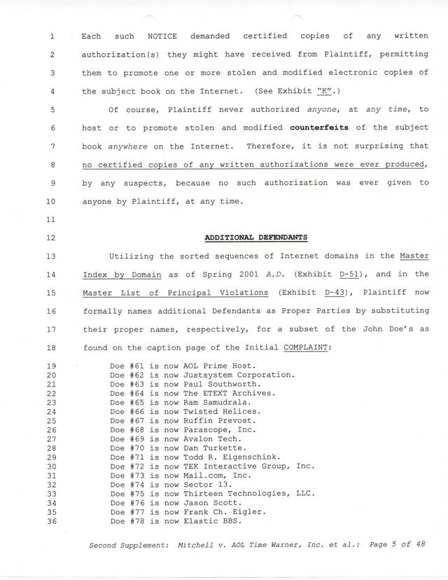 The threats and correspondence from Paul Andrew Mitchell hit a peak with the arrival of this document, a "verified complaint" sent via mail that laid out in one place all of the charges, claims and facts from Paul Mitchell's point of view. Named in this complaint are dozens of defendants (and thousands beyond them unnamed) as well as descriptions in excruciating detail of the entire process up to that point. Much of it is repetitive but the entire document is reproduced for clarity.