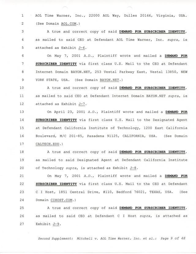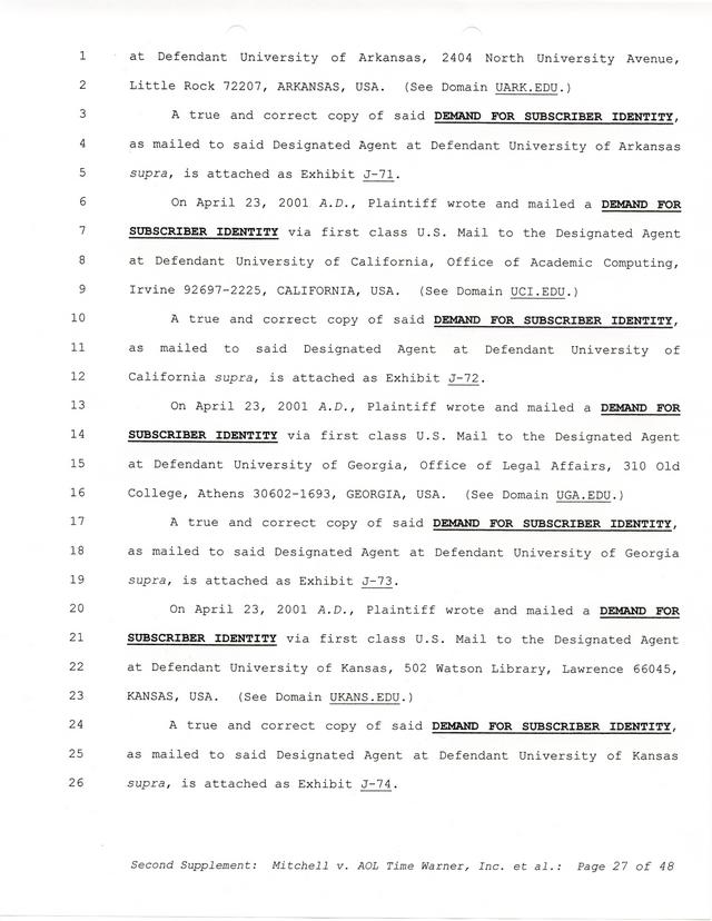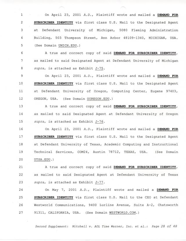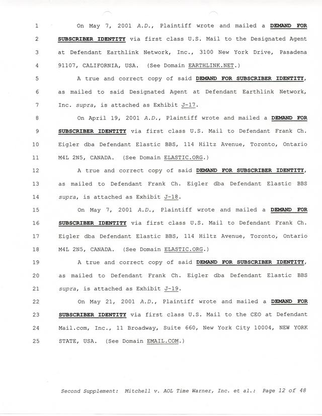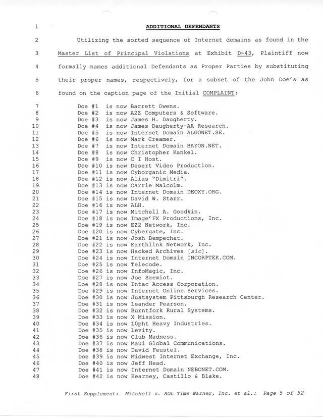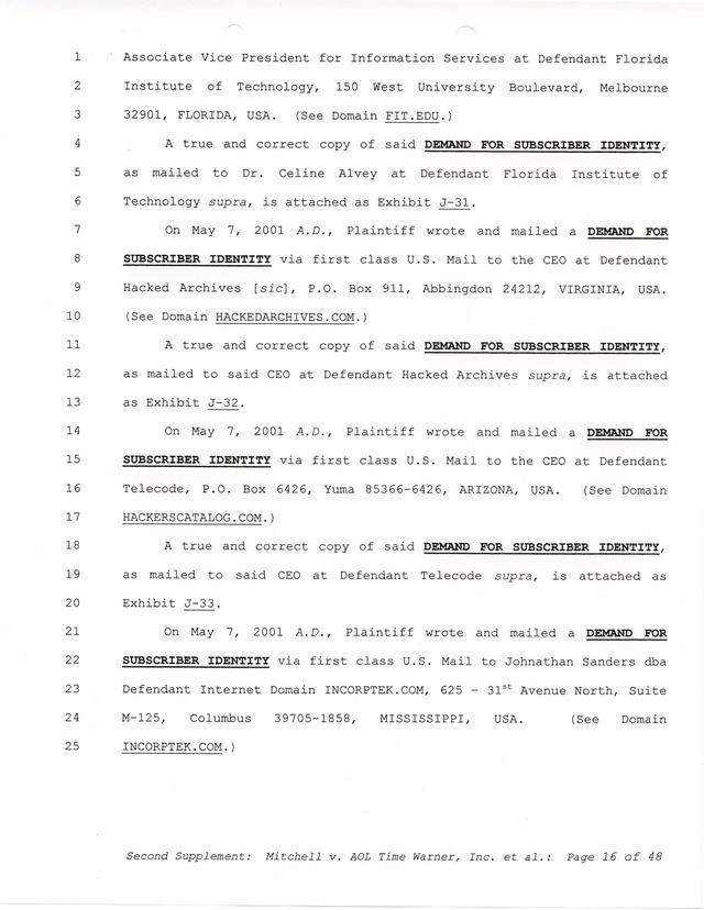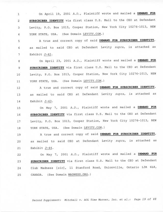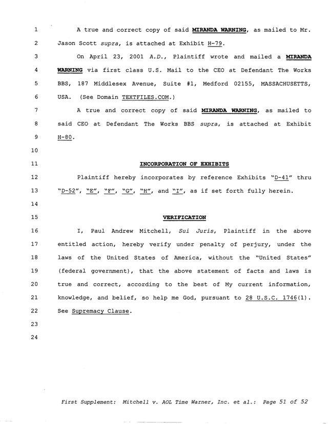 The threats and correspondence from Paul Andrew Mitchell hit a peak with the arrival of this document, a "verified complaint" sent via mail that laid out in one place all of the charges, claims and facts from Paul Mitchell's point of view. Named in this complaint are dozens of defendants (and thousands beyond them unnamed) as well as descriptions in excruciating detail of the entire process up to that point. Much of it is repetitive but the entire document is reproduced for clarity.