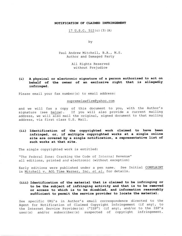 | NOTIFICATION OF CLAIMED INFRINGEMENT (October 28, 1998)