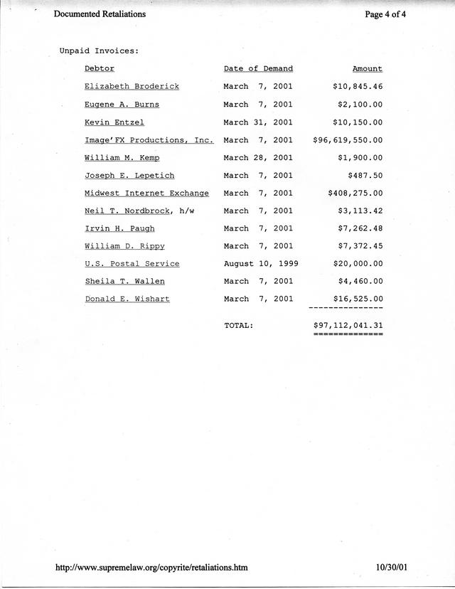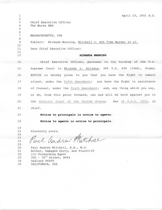 | NOTICE OF INTENT TO SUE AND MIRANDA WARNING (April 23, 2001)