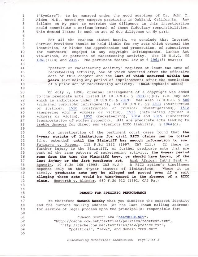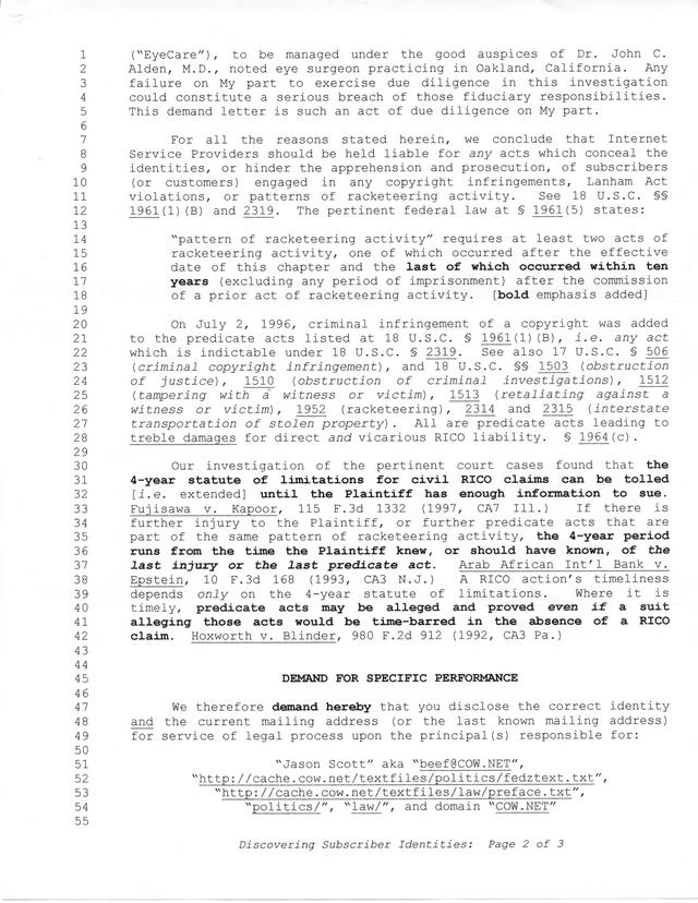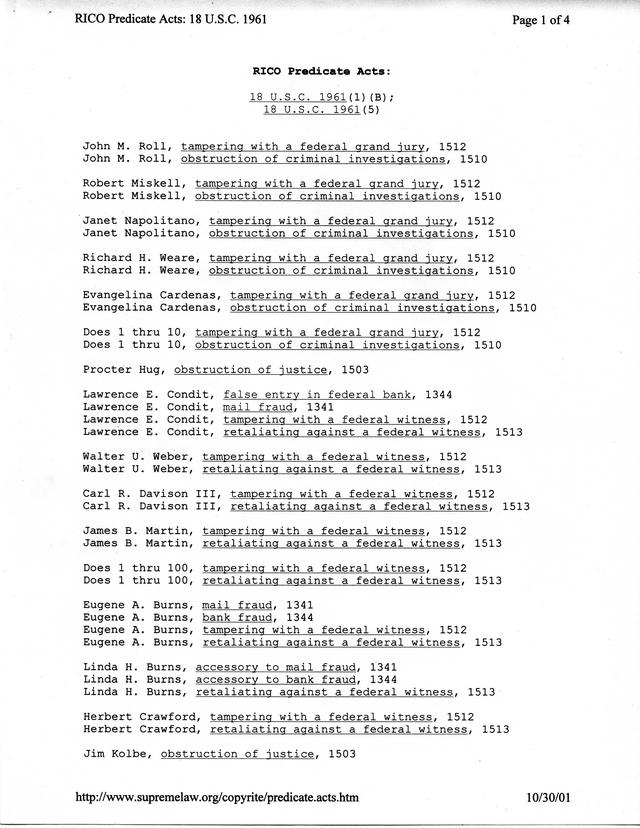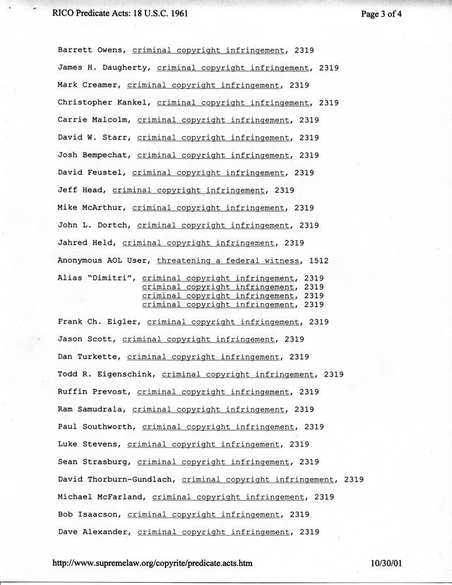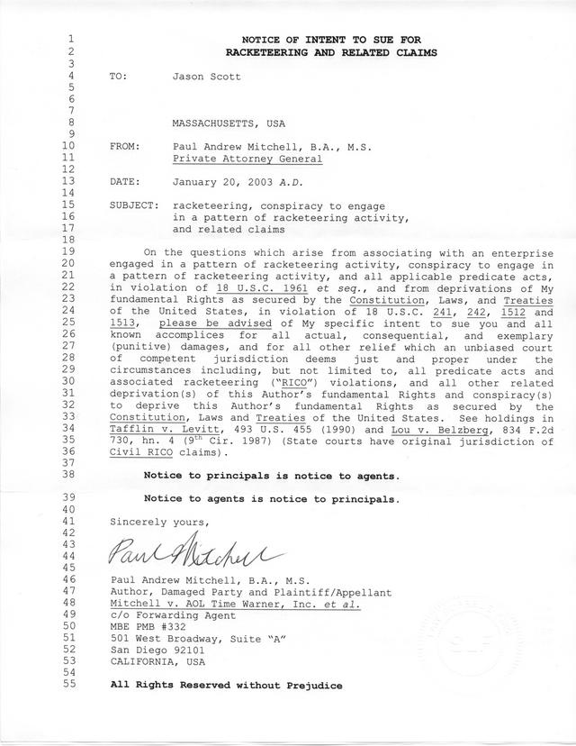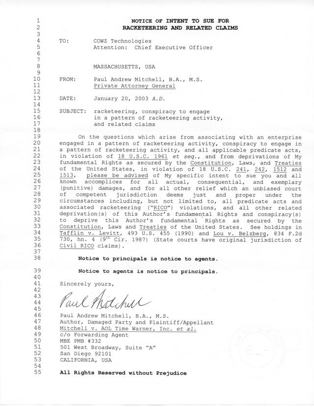 | NOTICE OF INTENT TO SUE FOR RACKETEERING AND RELATED CLAIMS (January 20, 2003)
