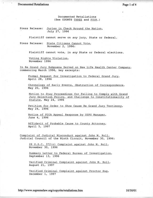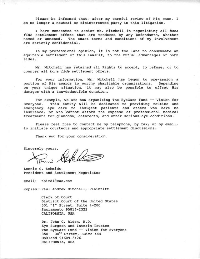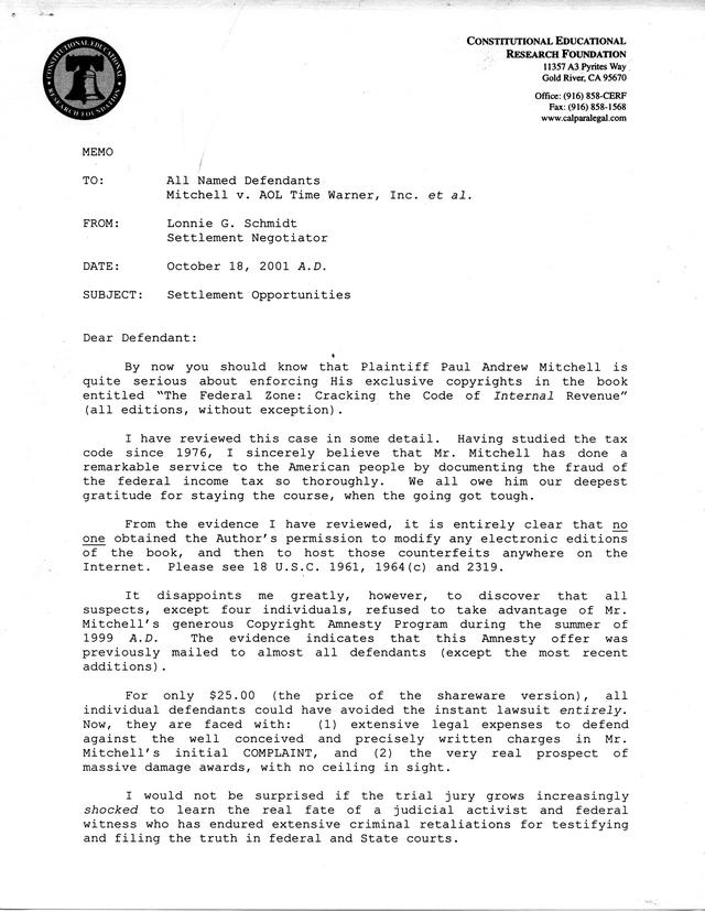 | OFFER TO SETTLE MITCHELL LAWSUIT WITH THE CONSTITUTIONAL EDUCATIONAL RESEARCH FOUNDATION (October 18, 2001)