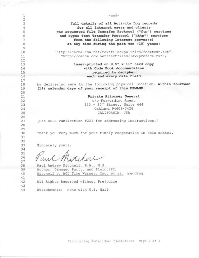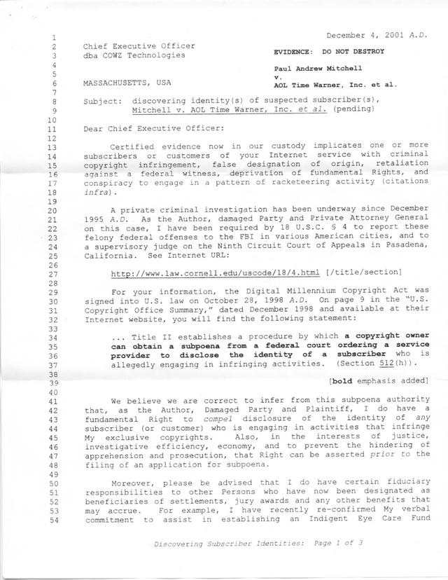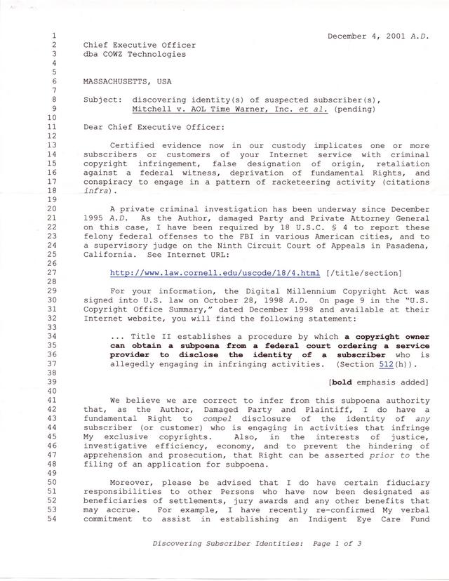 | SECOND DEMAND FOR IDENTITY OF SUBSCRIBER (December 4, 2001)