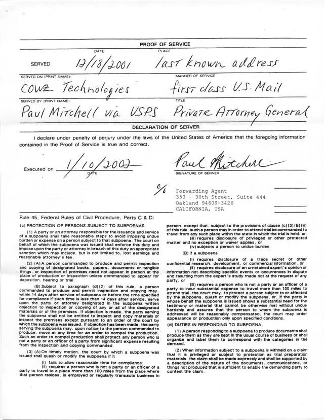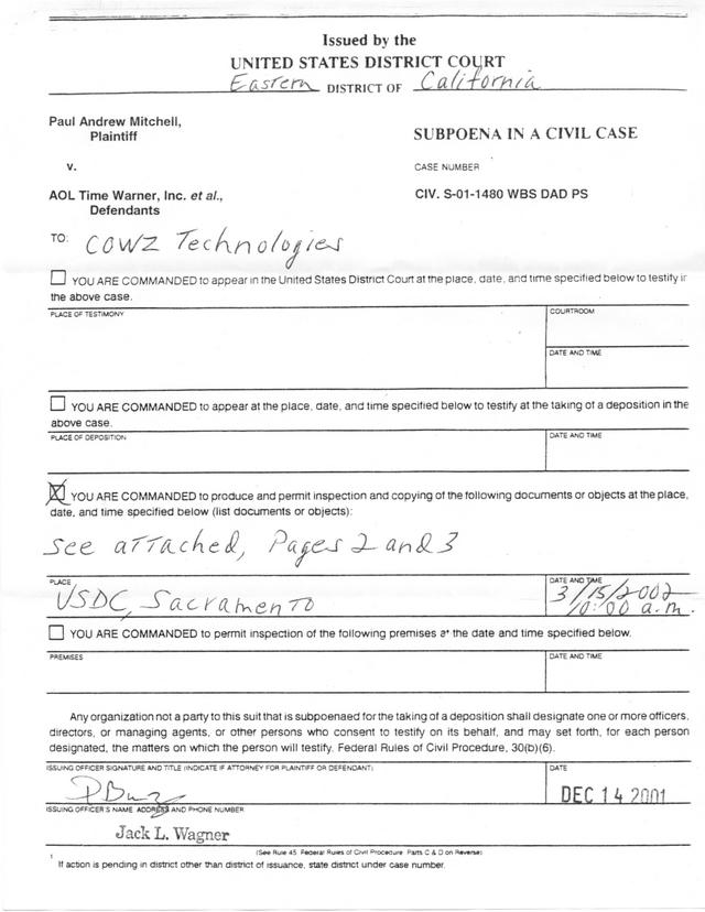 In which, for the first time, actual legal documents are used to attempt to subpeona a defendant into the case